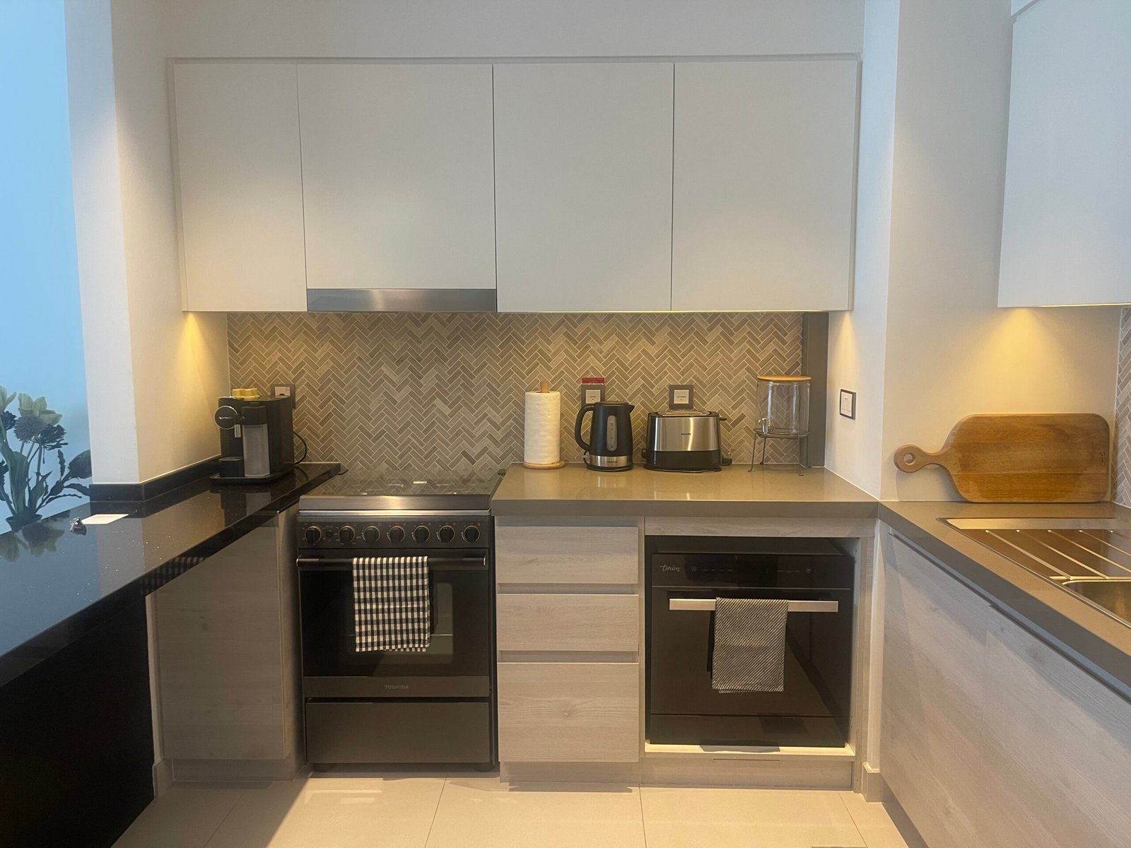 The space step into a bright, stylish living space featuring floor-to-ceiling windows, elegant décor, and a private balcony where you can enjoy your morning coffee. The open-plan kitchen is fully equipped with everything you need, and the cozy bedroom ensures a restful night’s sleep with premium linens and blackout curtains.
